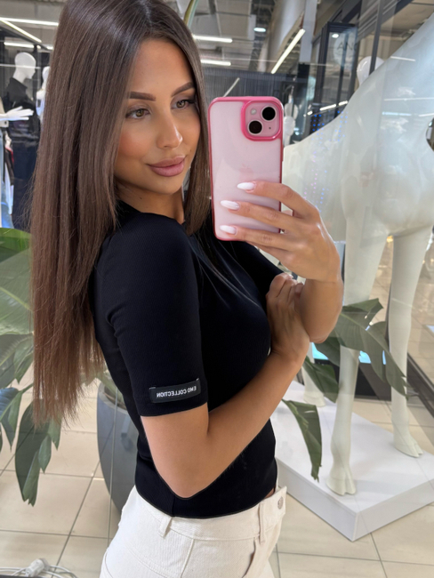 • Short-sleeved blouse in front of the elbow, made of super stretchy ribbed material, perfectly fits the figure and emphasizes the waist.