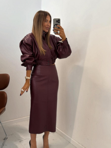 Długa spódnica z eko skóry z rozcięciem z tyłu - Bordo